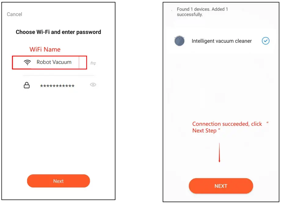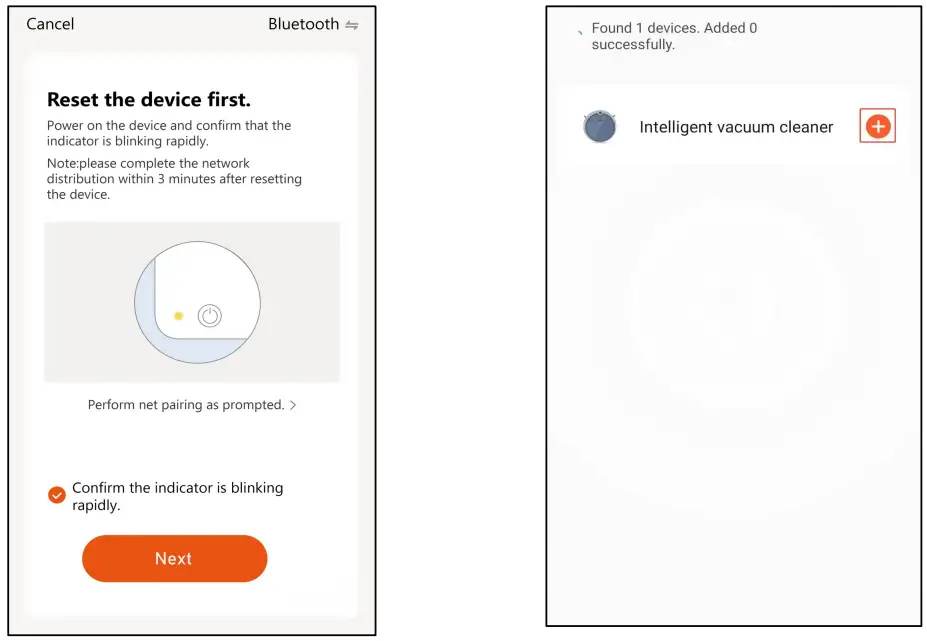(2) Turn on the switch key at the bottom of robot cleaner and press the recharge key for 3 seconds. At this moment the red indicator goes out and the green indicator flashes quickly, indicating that the WiFi has been turned on ,the mode of fast distribution network is ready, and waiting for the connection to be established. After that,click the “confirm that the indicator is flashing” option, and connect according to the app prompts in turn; as shown in the following figure: