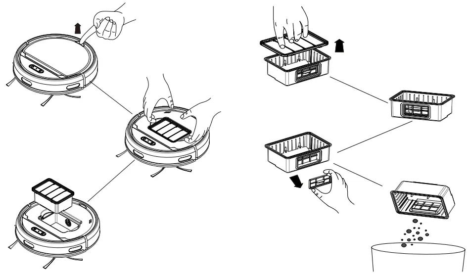 - Open the upper cover, put your fingers into the groove of the dust box, hold the dust box tightly and take it out upward. As shown in below figure