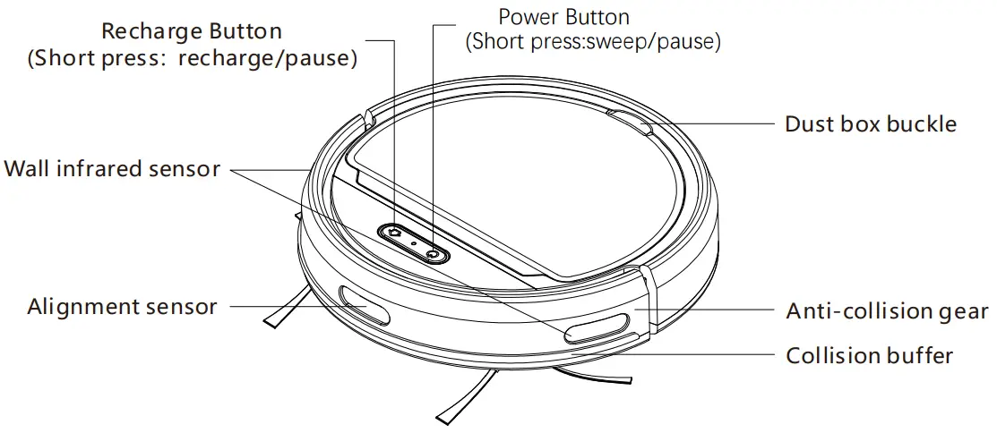 ” keyRecharging mode starts.Turn on the power switch and press the recharge key for 3 seconds, the APP connection mode starts. Please refer to app operation instruction for specific distribution network mode.