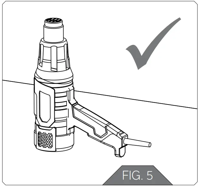 ![]() | WARNING Always place a hot heat gun on a level surface UPRIGHT (FIG.5) |