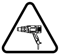 ![]() | WARNING: Danger of fire! An unsupervised operating hot heat gun can set fire to objects that are close by. The heat gun must be supervised at all limes during operation. When allowing the switched off heat gun to cool down, always place it down vertical and standing. Allow the heat gun to cool down completely |