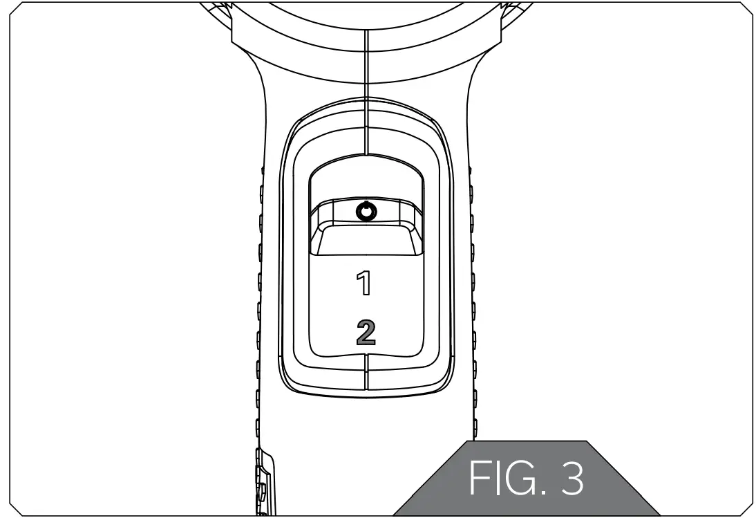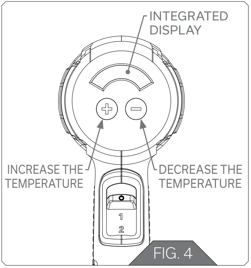(FIG. 4) The temperature can be increased and decreased in intervals of 30°C (86°F) via the control panel when the stage is I, and the temperature can be increased and decreased in intervals of 55°C (131°F) via the control panel when the stage is II. To increase the temperature press the left-hand button (+); to decrease the temperature press the right-hand button (-). Either tap the buttons briefly or press and hold the buttons until the desired temperature setting is reached. When doing this, please note the maximum temperature, which depends on the on/off switch. The maximum temperature is only possible in switching to stage 2. If switching to stage 1 is selected, the maximum temperature is 350 °C (662°F). The integrated display shows the temperature rating by colored increments.