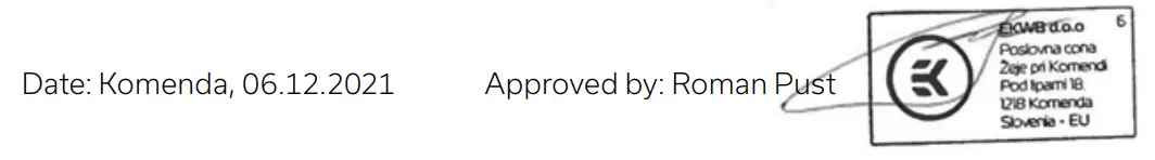 ![]() DECLARATION OF CONFORMITYaccording to ISO/IEC 17050-1 and EN 17050-1 EKWB, d.o.o. Declare, under it sole rensponsibility that the product Product Name and Model: Regulatory Model Number: (YYYY – production year; OO – order No.; NNN – the running S/N)