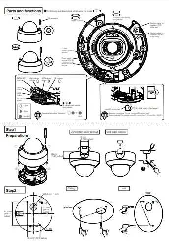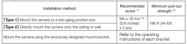 - The screw length is an example when installing the camera on a robust ceiling or wall with a thickness of 20 mm {25/32 inches} or more.