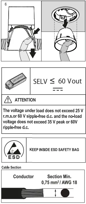 - Class I luminaire: Device with a very low safety voltage. Connect the main cables to the remote led power supply SELV under the EN 61347-2-13 standard, respecting the right polarity (red positive black negative). Devices with a very low safety voltage showing the (BTS) mark should not be connected to earthing conductors.