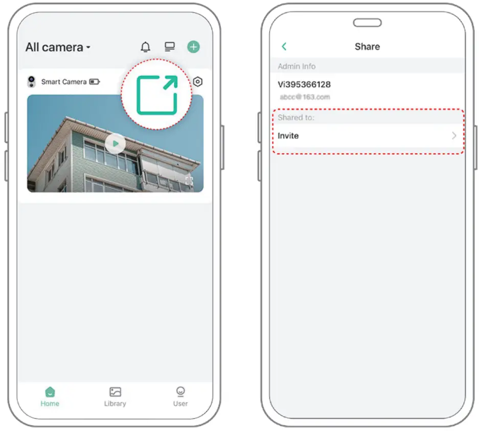 1) Find the camera you want to share on the App homepage or camera setting page. Find the button and enter the sharing page.