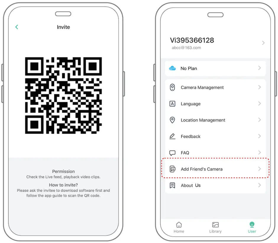 3) For the members you need to share, find “Add Friend’s Camera” in the “User” page to enter the scanning page.