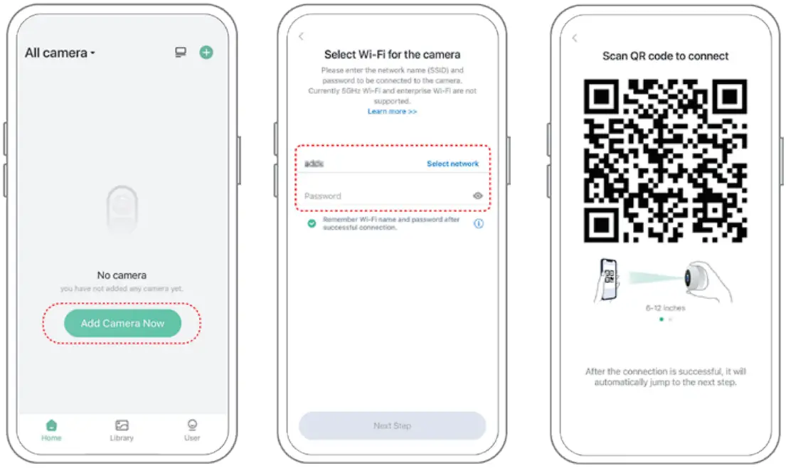 1) Click the “Add Camera Now” in the App and enter the Wi-Fi network name and password that you want the camera to connect. To ensure a longer distance connection, the camera only supports the 2.4Ghz Wi-Fi with stronger wall penetration capability and does not support Wi-Fi for enterprise-level authentication currently. Please ensure that the entered Wi-Fi meets the requirements. After completion, click “Continue” to generate the QR code for pairing the camera.