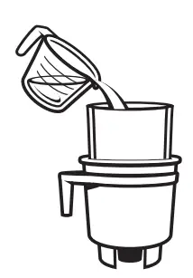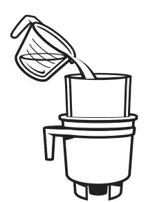 Next, add 1 cup (250 mL) of water into the bottom of the Toddy brewing container and 6 ounces (170 g) of ground coffee. Slowly pour 3 more cups (700 mL) of water over the grounds in a circular motion. Wait 5 minutes, then add the remaining 6 ounces (170 g) of ground coffee. Finally, slowly add the last 4 cups (950 mL) of water. DO NOT STIR (stirring the bed of grounds can result in a clogged filter). Lightly press down on the topmost grounds with the back of a spoon to ensure all grounds are wet.