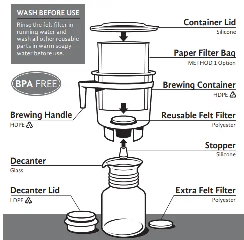 - Fill First, insert the stopper into the outside bottom of the brewing container; then, dampen the discshaped felt filter and insert it into the inside bottom of the brewing container.