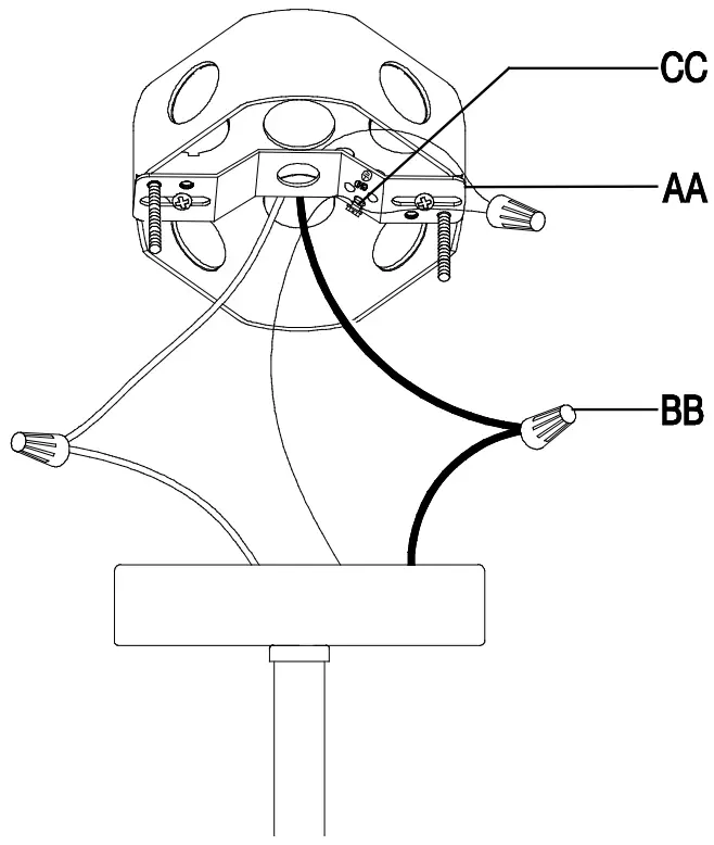 - Wrap the middle of the ground wire from the fixture around the ground screw (CC) on the mounting strap (AA), and use a wire connector (BB) to connect the end of the ground wire from the fixture to the ground wire from the outlet box.