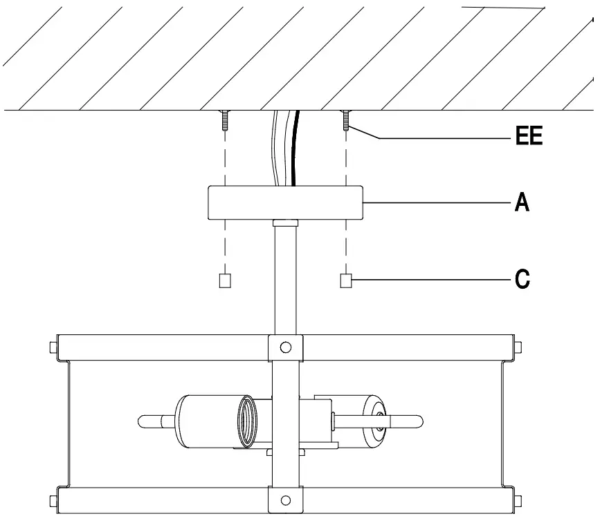 - Screw the lock nuts (C) onto the mounting screws (EE) to secure the canopy (A).