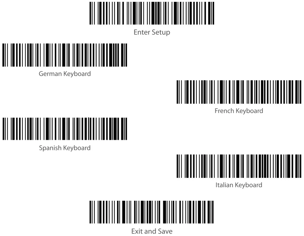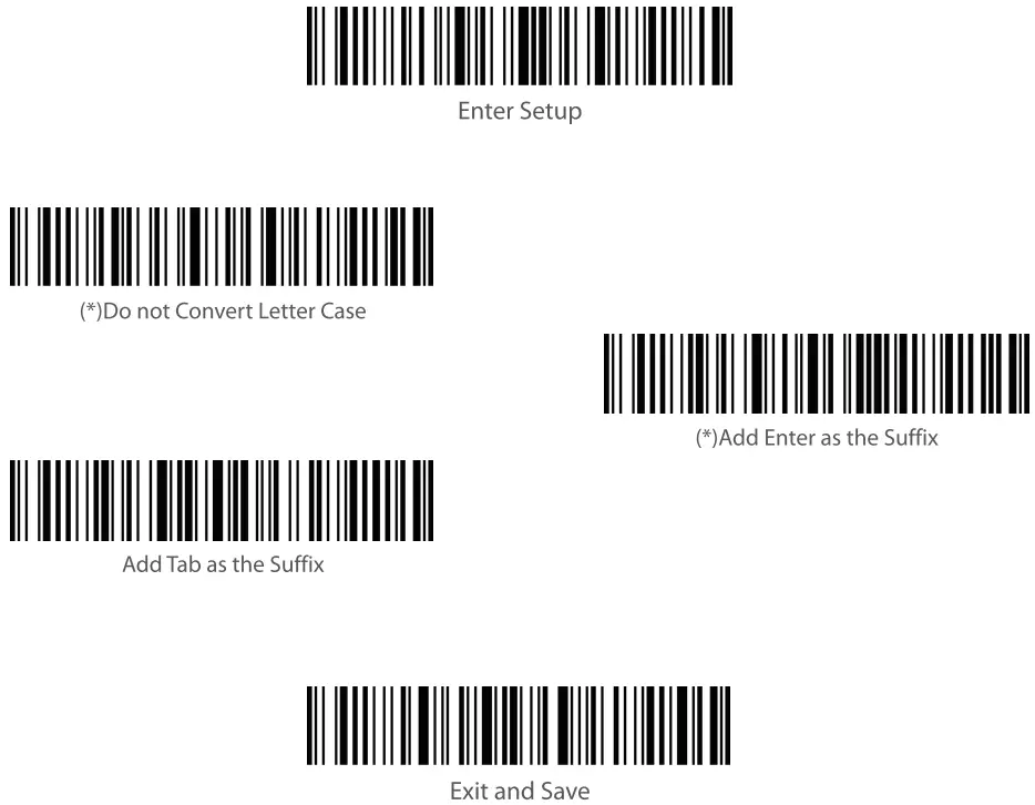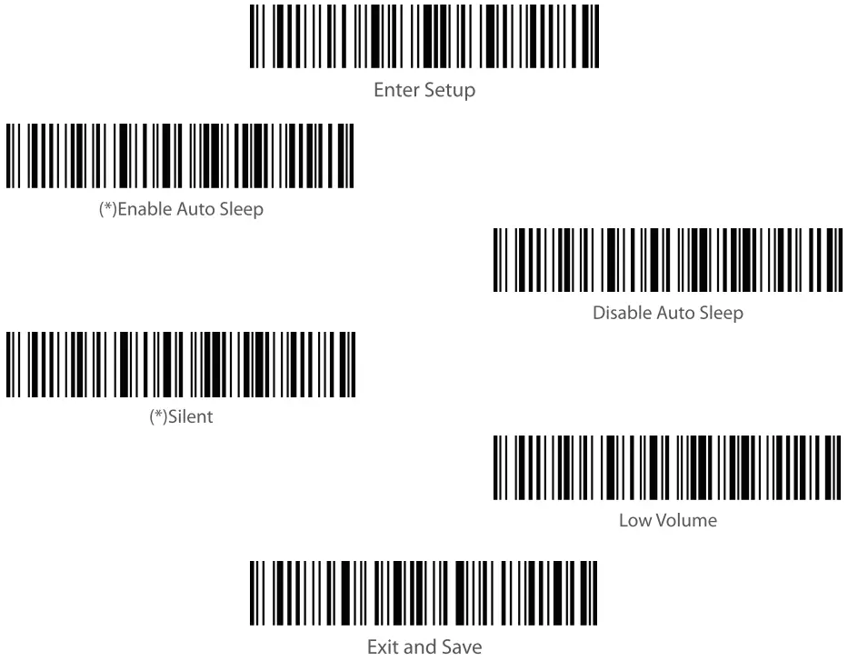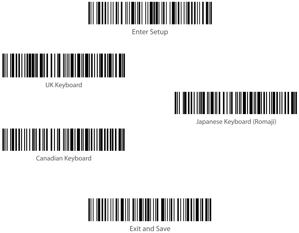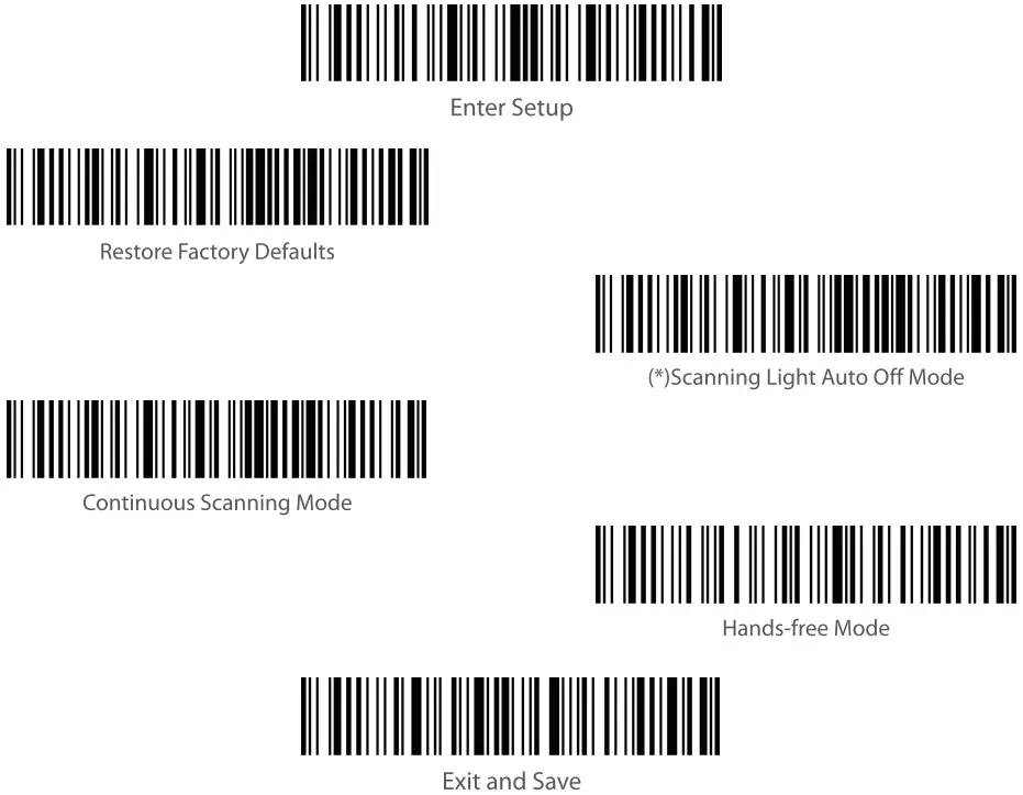 | Note: It is not necessary to scan “Enter Setup” or”Save and Exit”when scanning the 5 barcodes [ below. Simply scan the barcodes to activate the functions. |