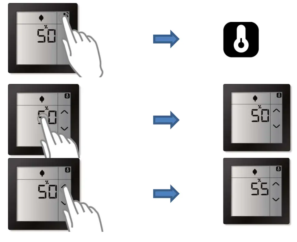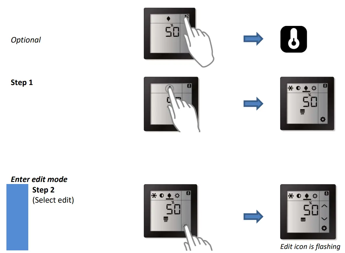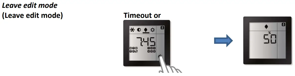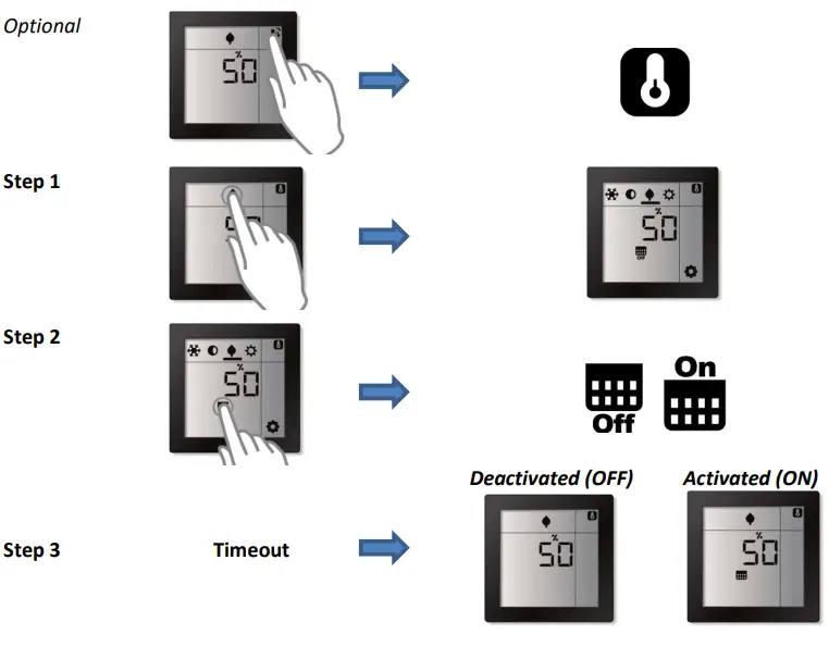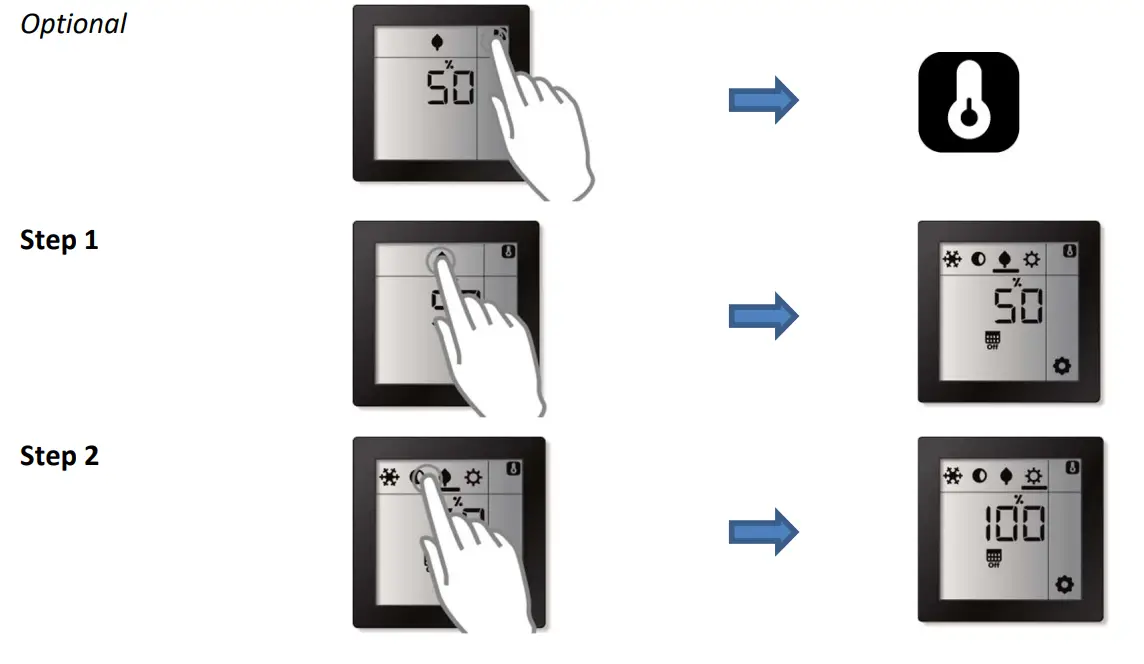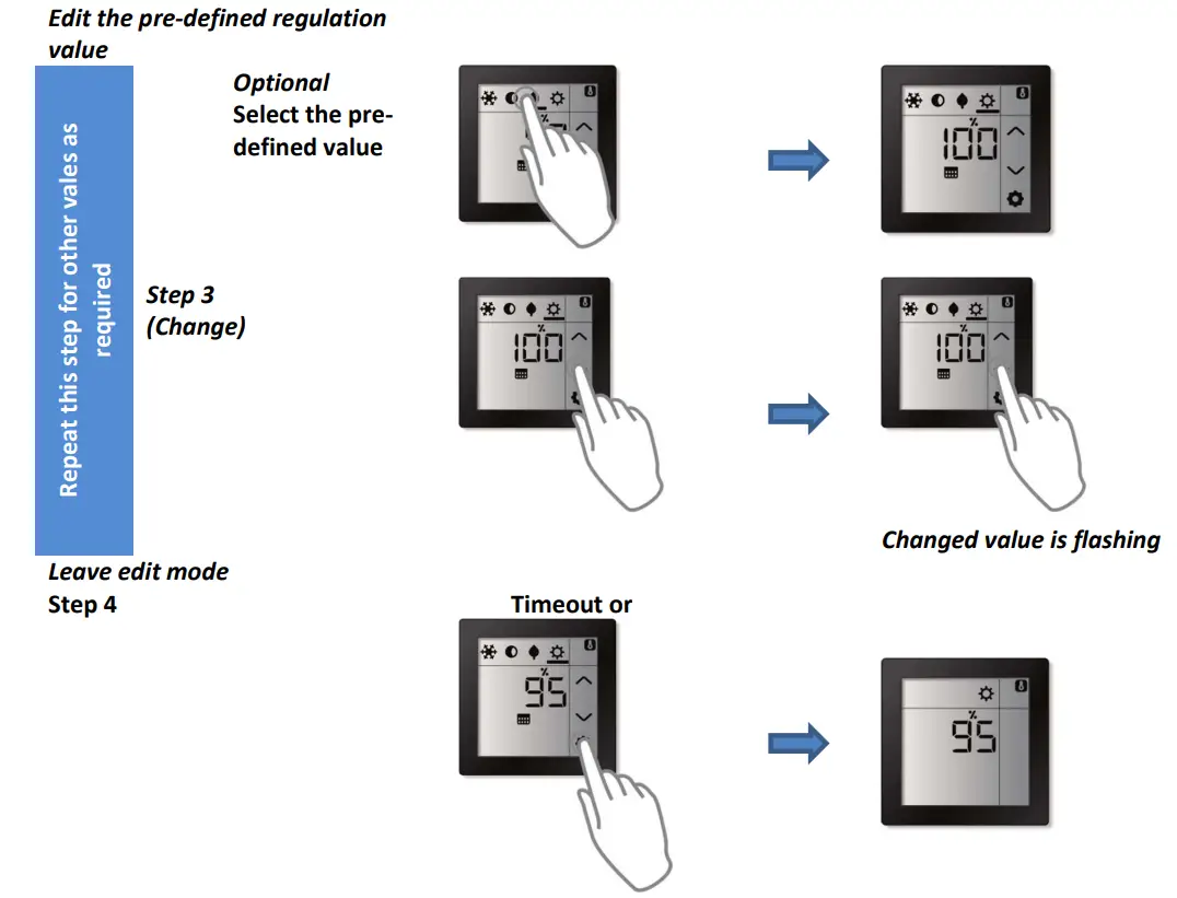 The Room Controller Touch supports up to 4 different pre-defined regulation values (operation modes) which can be manually (re-)programmed via the screen.