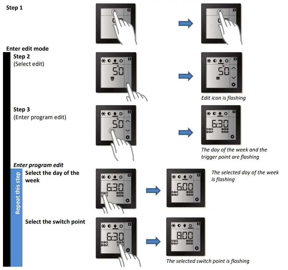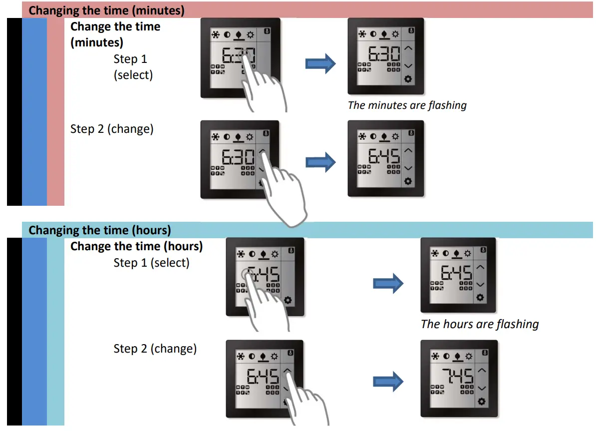 For each day of the week, the Room Controller Touch supports up to 6 manually (re-)programmable timeslots during which it will switch from one pre-defined regulation value (operation mode) to another.