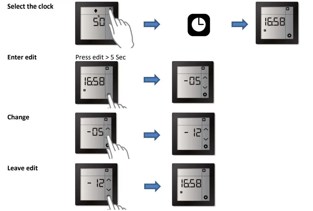 If the internal clock of the Room Controller Touch is inaccurate, it is possible to configure the number of seconds by which the clock needs to be corrected each month (-99 to +99 seconds).