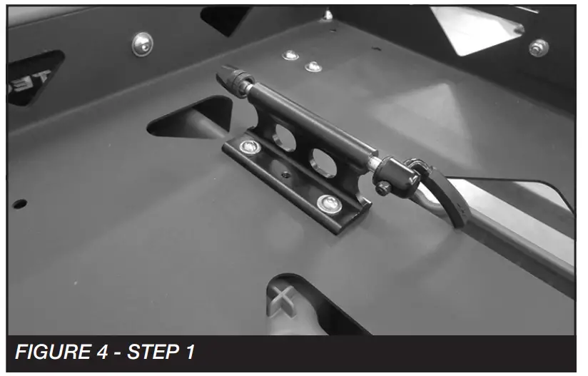 1. Install FT50812 (Bike mount) to the set of holes located either offset to the left or right center of the Fabtech cargo rack.using the provided 1/4″ x 7/8″ bolts, nuts and washers. Torque all hardware to 12 ft-lbs. SEE FIGURE 4
