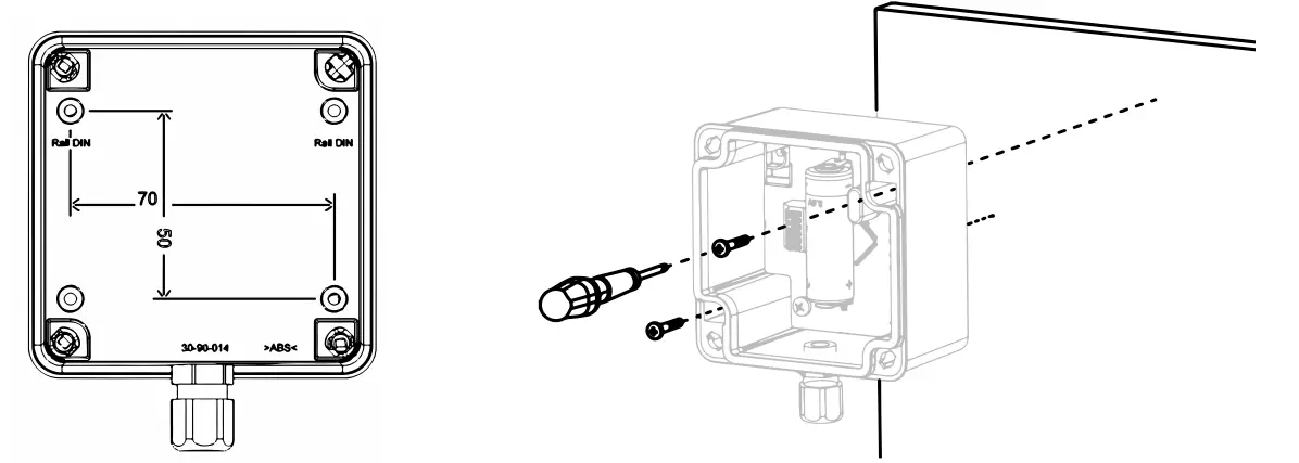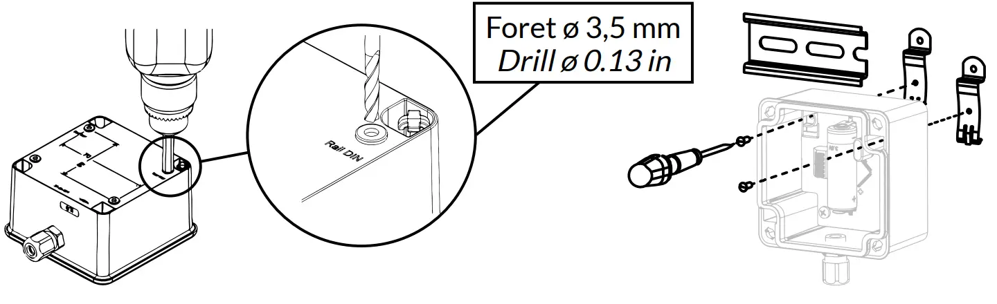 Attention, après mise en place du kit rail DIN, l’indice de protection du boîtier passe en IP50. Please note that after installation of the rail DIN kit, the protection rating of the housing will change to IP50.