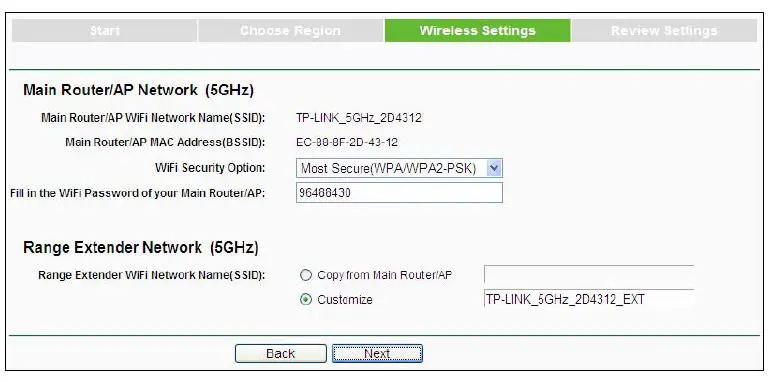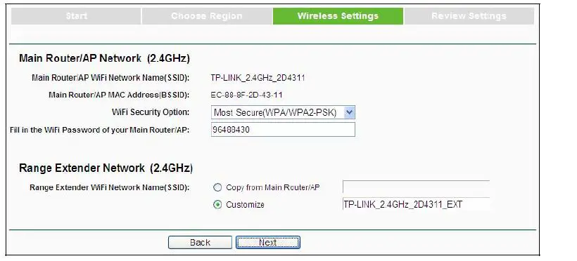 - Wireless Settings page will appear as shown in Figure 3-9. Enter the WiFi Password of your main Router/AP, name your range extender WiFi network or keep it default, and then click Next to continue.