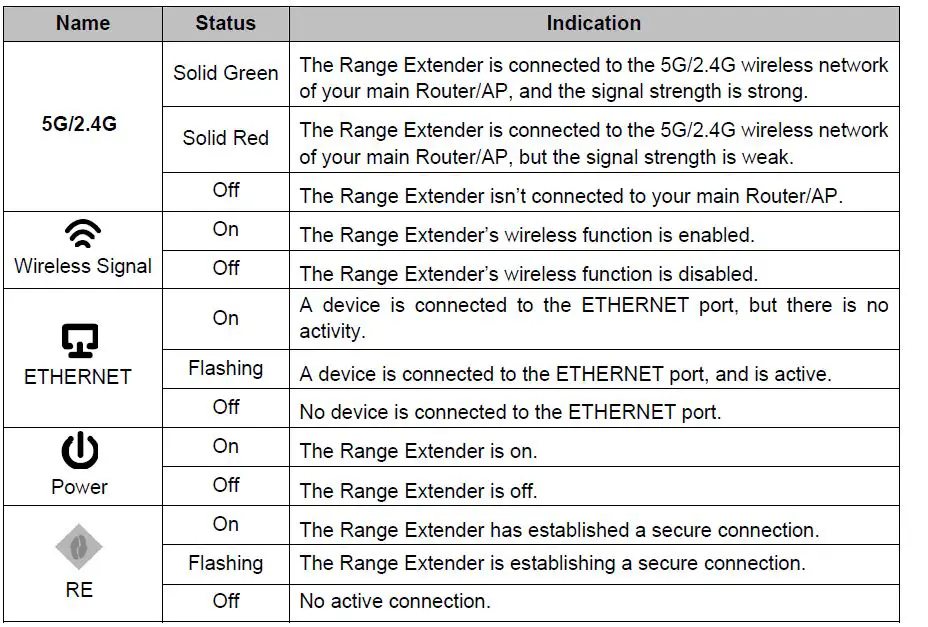 - RESET: This button is used to restore the Range Extender’s factory default settings.There are two ways to reset the Range Extender’s factory defaults:Method One: With the Range Extender powered on, use a pin to press RESET button (about 1 seconds) until all the LEDs flash once. And then release the button and wait the Range Extender to reboot to its factory default settings.