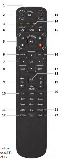 Note: Some functionality (e.g. PVR) may not be available on specific models of set-top box (STB), also functionality may vary with the type of TV service delivered by your service provider.