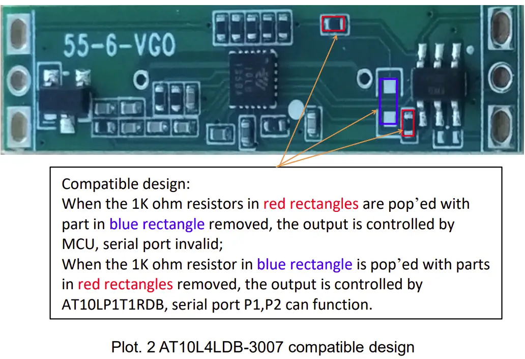 The output can be controlled by MCU (default) or by AT10LP1T1RDB. In MCU control mode, the output is alternated between logic high and low for every sensing. In AT10LP1T1RDB control mode, the output will be logic high lasting for a period and go back to logic low for every sensing. The setting for the 2 modes are illustrated in Plot. 2.