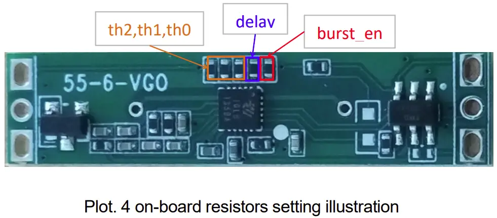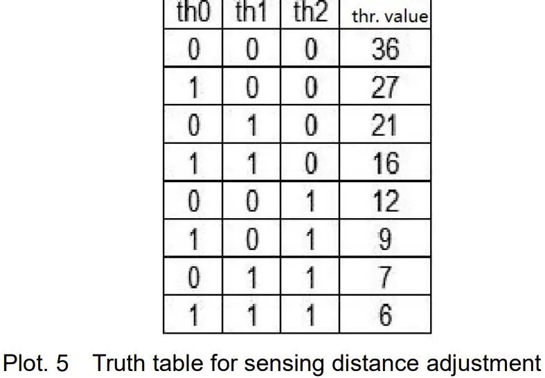 Resistors in yellow rectangle (th0, th1, th2) offers 8-shift sensing distances. The resistor NC is logic 1 resistor 0R is logic 0. The truth table of the 3 resistors is in Plot. 5.The smaller value of threshold results in longer sensing distance. (Note: when OTP threshold is configured, the 3 resistors setting is invalid.)