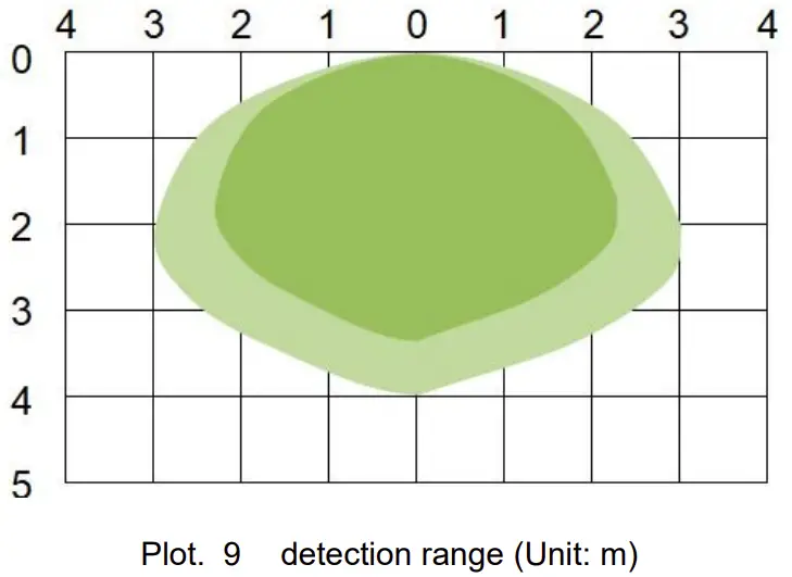 The module’s detection sensitivity can be adjusted by resistors. The maximum distance is 5 m. Below plot illustrates a typical detection range. If the threshold is set high, the detection range will be larger. In Plot. 9, dark zone means high sensitive areas that an fully detect movements. Light zone means low sensitivity which basically can detect movements but not always guaranteed.