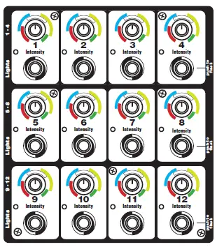 Intensity – This control is used to set the brightness of the corresponding light head. When this knob is pushed down, it will momentarily