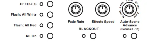 Fade Rate – When scenes are changed, they fade from one color to the next; this controls the duration of that fade. Effects Speed – This knob controls the speed at which effects operate. This control also affects the fade rate, including the fade rate of audio effects. - Effects