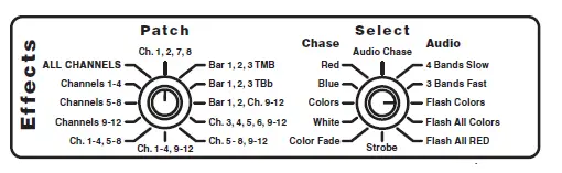 The positions marked Bar 1, 2, 3 TMB and Bar 1, 2, 3 TBb are intended to be used with the four channel audio effect. TMB is Treble, Mid, Bass, in this case 90 Hz bass. TBb is Treble, bass and bass. B is 90 Hz bass and b is 45 Hz bass. In most music the 90 Hz bass hits first and the 45 Hz is the fade out of the bass. In some music these will be separate beats. Some music will have very little 45 Hz content and will not often trigger the blue lights. Each Bar is one band and all the lights on one bar go on together. The patch position marked Ch. 1, 2, 7, 8 spreads the effects over two light bars leaving two lights on each to illuminate performers. The position marked Bar1, Bar2, 9-12 is intended for use with audio effects, it will flash one whole bar with the 90 Hz bass, another bar with 45 Hz bass and the remaining bar (if used) will show 3 or 4 channels depending on the audio effect selected. The Position marked Ch. 3, 4, 5, 6, 9-12 sends effects to all but four lights. - Effects Select