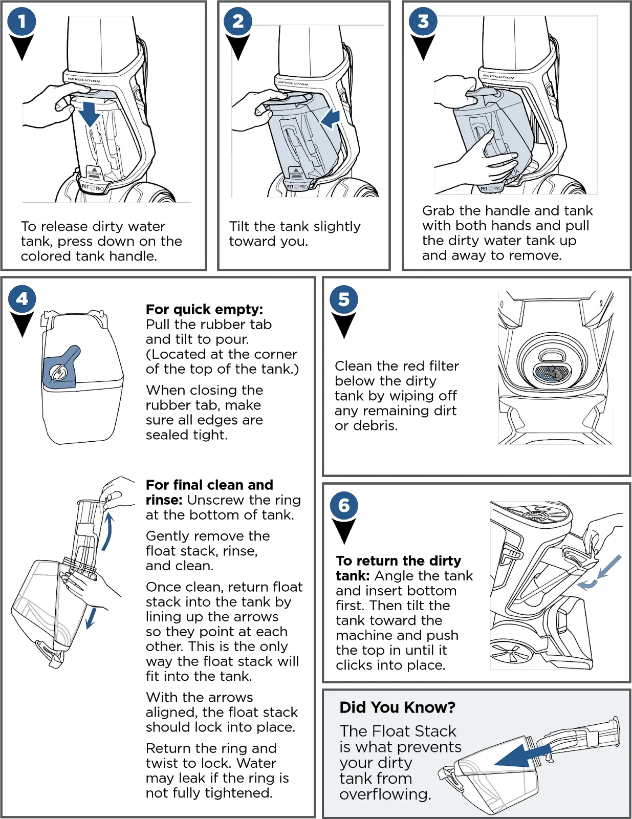 The dirty tank has picked up the maximum amount of dirty water and has reached the full line | Empty dirty tank | |