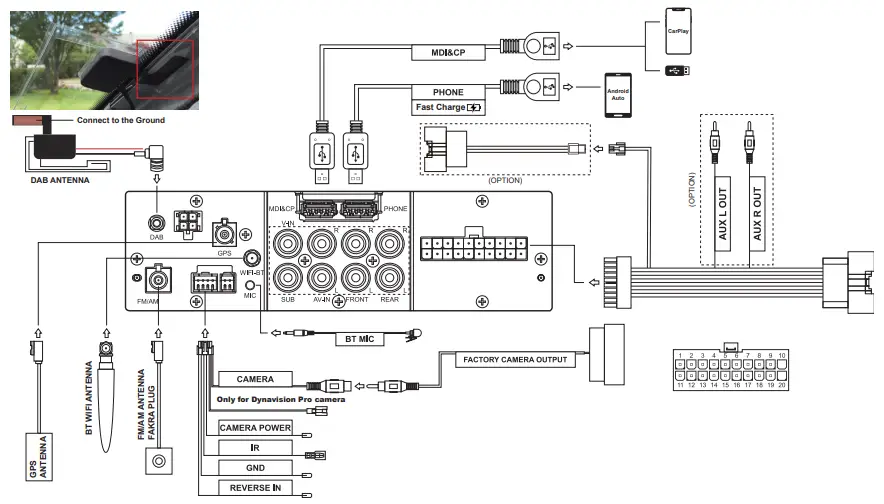 See the wiring diagram below for all accessory and wiring harness connections. Please note the wiring and installation instructions for the DAB antenna.