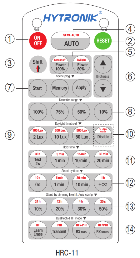 - Select the buttons in 8 “Detection range”, 9/10 “Daylight threshold”, 11″Hold time”, 12 “Stand-by time”, 13 “Stand-by dimming level” to set all parameters.
