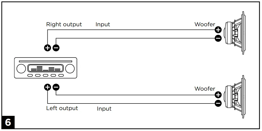 | 6. If a subwoofer is installed in your vehicle, it is important to secure it firmly. We recommend that you attach the enclosure to the floor or chassis of the vehicle for safety. If the subwoofer is not properly secured, it could become a projectile in the event of an accident. This point is even more important if the subwoofer is installed in a hatchback, a station wagon, a utility vehicle or a van.