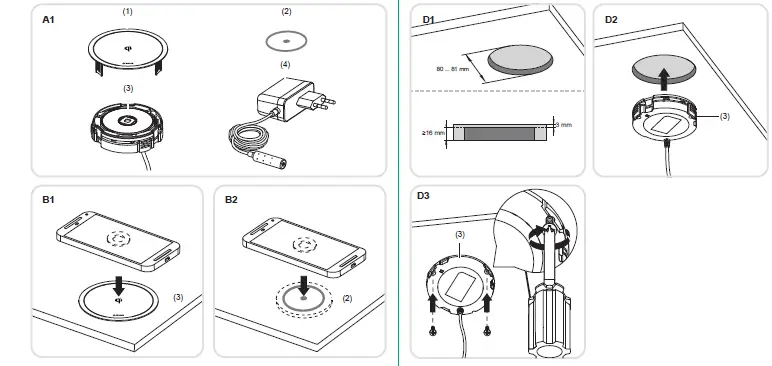 The pad is free from any metalliferous objects and cleaned. - Place the mobile end device over the built-in (Figure B1)/sub-mounted (Figure B2) charging station so that the receiver inductor is positioned approximately centrally on the pad (1)/label (2).