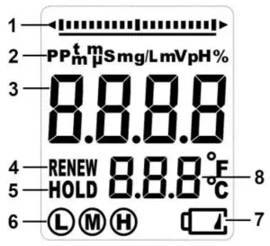 - Press and Hold the MODE/HOLD button for 2 seconds and the display will begin to scroll through the units. pH; µS (Conductivity); ppm S (Salinity); ppm (TDS); mg/l (TDS); Note: The “HOLD” function cannot be on when changing the measurement function. If “HOLD” is displayed in the lower left corner of the display, briefly press the MODE/HOLD button to turn it off.