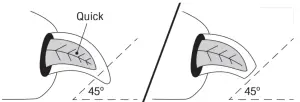 While grinding, keep checking the nail for a dark spot. This spot is the beginning of the quick. Once visible stop grinding immediately. Exposure of the quick will result in bleeding.