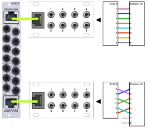 Octa link 1U is compatible with Doepfer’s A-180-9 Multicore module. If an Octa link 1U is connected to the top (1-8) RJ45 port on the A-180-9, then the numbered jacks correspond perfectly. That is, jack 1 on the A-180-9 connects to jack 1 on the Octa link 1U; jack 2 connects to jack 2, and so on.