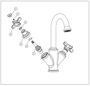Turn off the valves to release pressure of waterpipe. Unscrew the ceramic cap(1) and remove the bolt(2) with a screwdriver. Take out the handle(3) and sleeve(4). Then disassemble the flange(5)(use tool if needed). Take out the cartridge upward vertically. Assemble a new cartridge by reverse steps