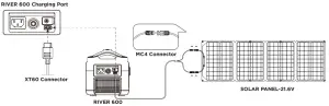 RIVER 600 has an AC charging port and an XT60 charging port located on the side of RIVER 600. The RIVER 600 can be charged via AC power or 12V car charger. Besides, you can also use solar panels and connect the solar charge cable to the XT60 solar charging port of RIVER 600 for charging.