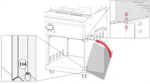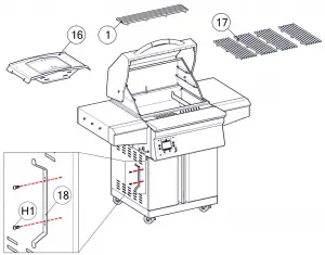 Secure shelf using 4x M6 Phillips Screws (H2) through the shelf body into the grill body. A screwdriver works best in this tight space.