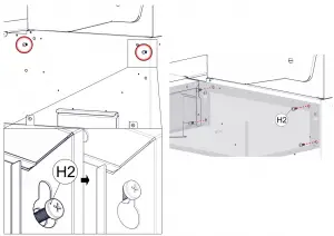 Thread 2x M6 Phillips Screws (H2) into the outer top shelf mounting holes as shown. Leave loose so that shelf keyholes can fit over.