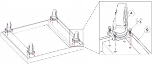 Attach 4x casters (#4) to cabinet bottom (#9) using 4x M6 Phillips Screws (H2) per caster.