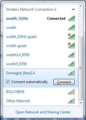- In the example below, the computer was connected to another wireless network named wraith_5GHz. The wireless network name of the Belkin RT series router, Damaged_Beez2.4 in this example, is shown selected.