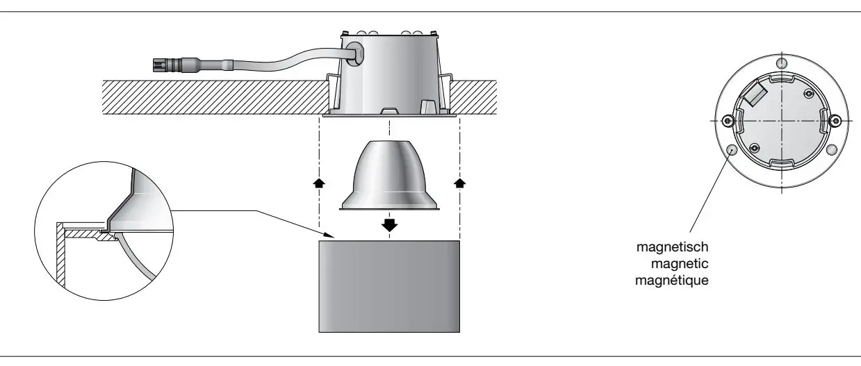 A recessed opening of ø 68 mm is necessary to accept the luminaire. Free space depth min. 55 mm (see sketch).