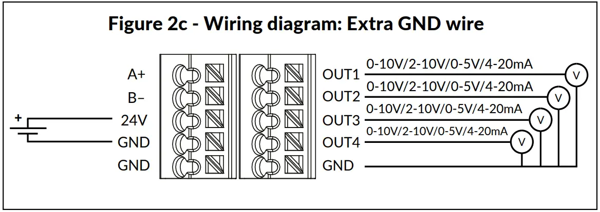 NOTE! When using long connection wires it may be necessary to use a separate GND wire for voltage output current to prevent measurement distortion. The need for an extra GND wire depends on the cross section and length of the used connection wires. If long and/or small cross section wires are used, supply current and wire resistance may generate a voltage drop in the common GND wire resulting in a distorted output measurement.