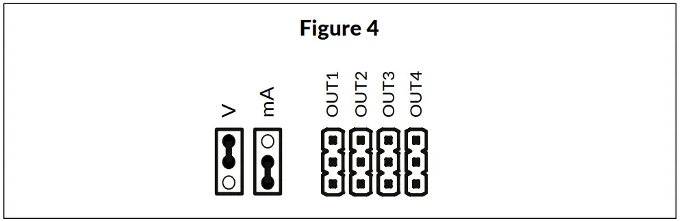 Select the output mode, current (4–20 mA) (optional) or voltage (0– 10 V) for each output (1-4) by installing jumpers as shown in Figure 4.
