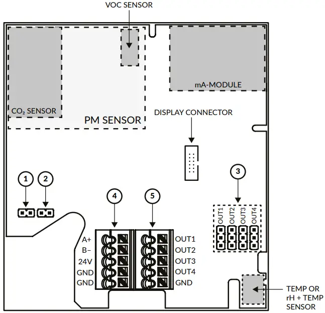 2) Output range selection with CO2- and PM-models:Install the jumper 1 (figure 3) to change output range. This feature is intended to use only on devices without display. On a display version of the device, the output range can be selected via the configuration menu. Please see the user manual for more details.