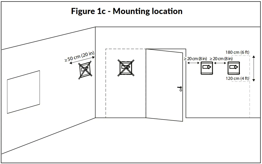 - Select a mounting location on the wall at 1.2–1.8 m (4–6 ft) above the floor and at least 50 cm (20 in) from the adjacent wall. Do not block device air vents from any direction and leave atleast 20 cm (8 in) gap to other devices. Locate the unit in an area with good ventilation and an average temperature, where it will be responsive to changes to the room conditions. The Siro should be mounted on a flat surface.